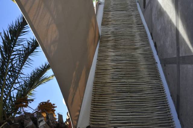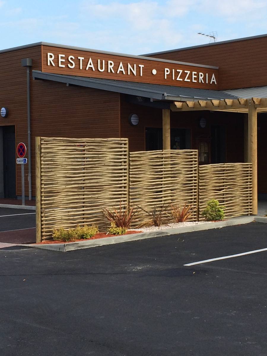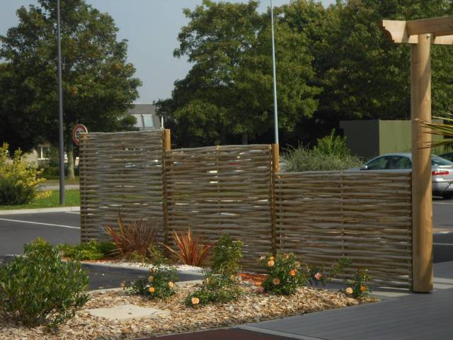 Brise-vue en rondins naturels d'eucalyptus tressés.