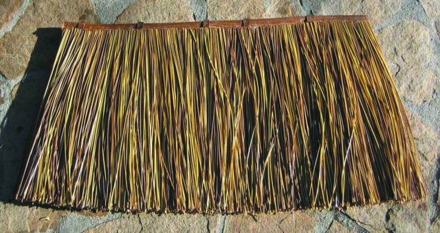 Roseau mixte : paille pleine sur le dessous et fibres synthétiques imitant le roseau naturel sur le dessus. La tuile dure entre 12 et 15 ans et ne grise pas.