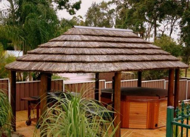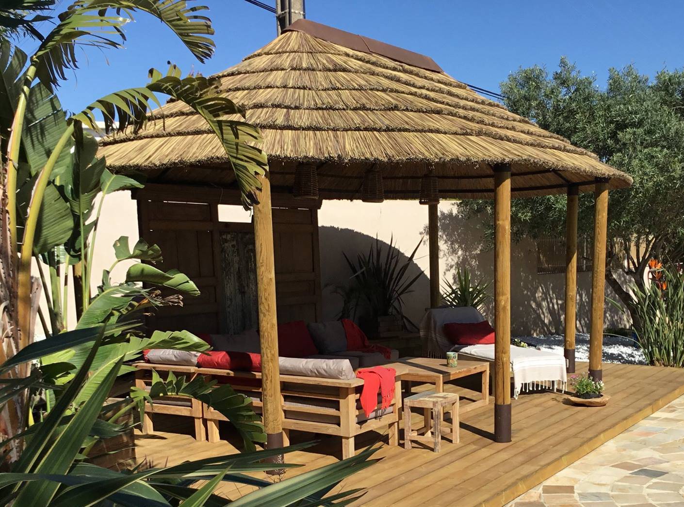 Paillote exotique ovale livrée en kit à monter avec 6 poteaux en pin traité de 2,40 m.