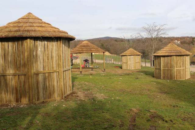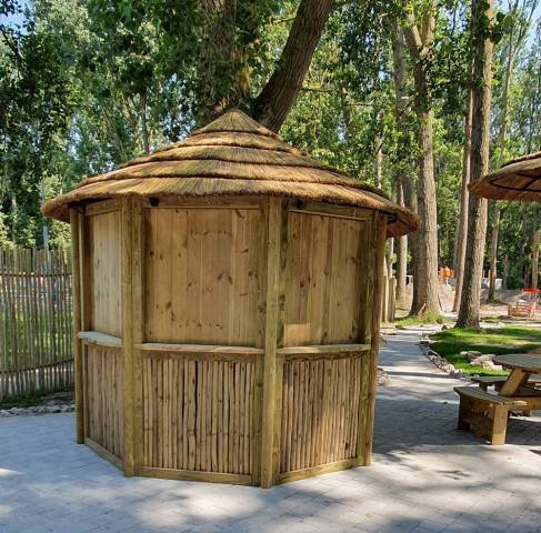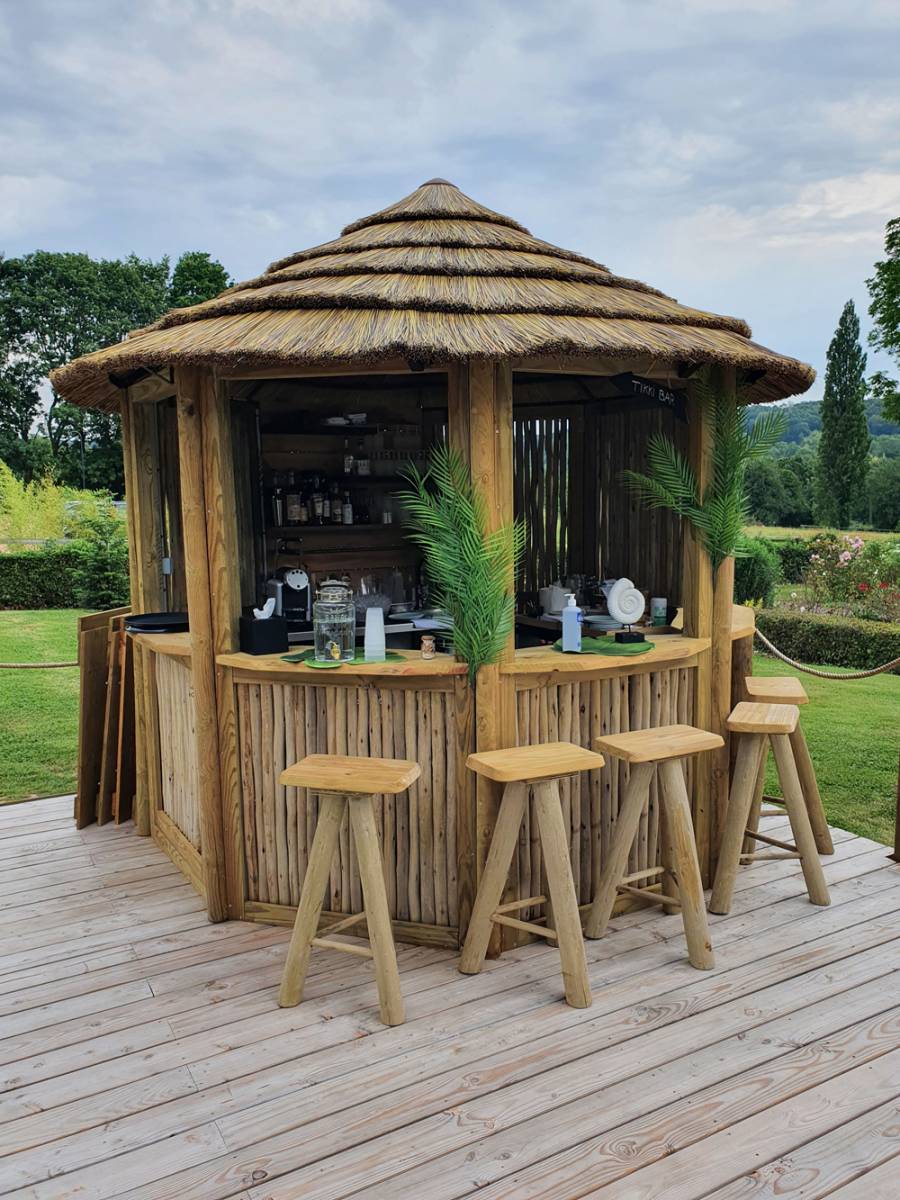 Se compose de 4 panneaux pleins + 3 demi-panneaux comptoir + 1 demi-panneau porte et comptoir avec toiture en roseau ou palme Ø 3,30 m.