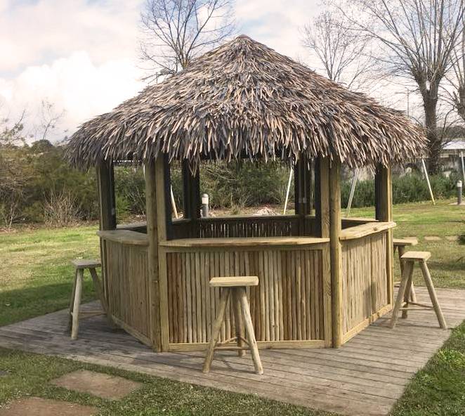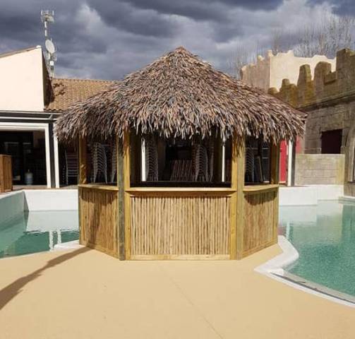 Se compose de 5 demi-panneaux comptoir + 1 demi-panneau porte et comptoir avec toiture en roseau ou palme Ø 4 m.